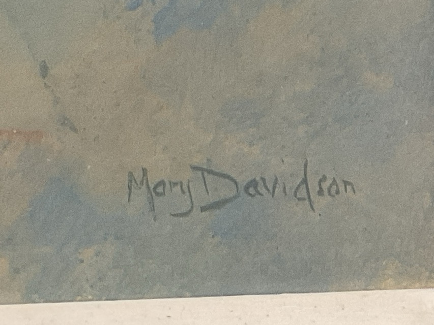Mary Davidson, gouache on board, coastal view with rocks & beach, labelled to verso Iona, signed and contemporary framed. (11.25in x 11.25in)