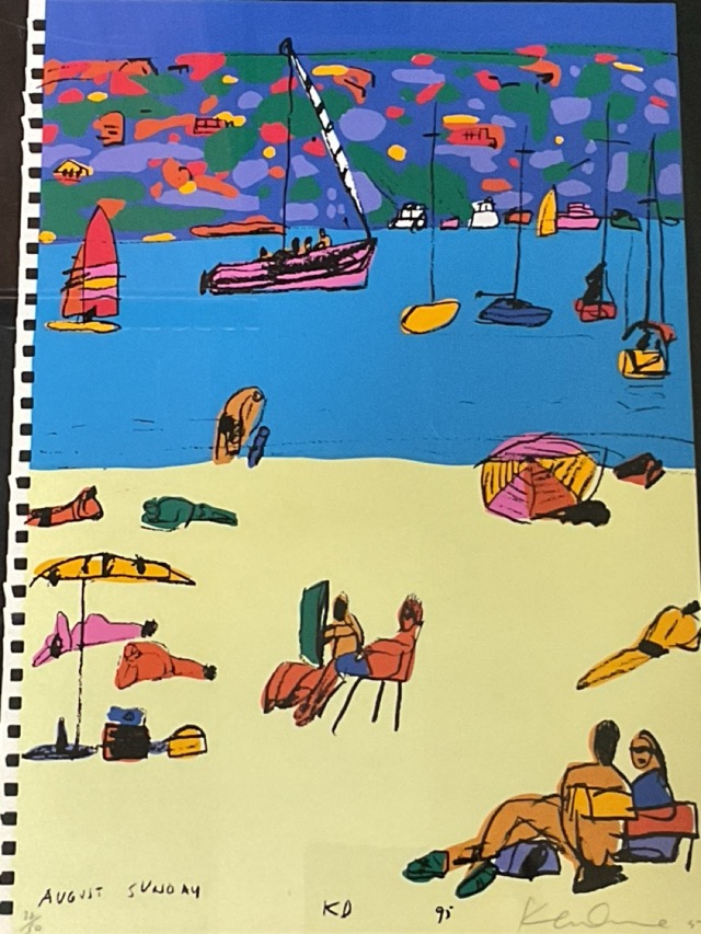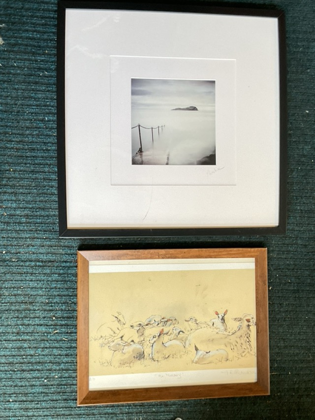 FR Richardson, artists proof print of sheep titled The Nursery, signed & framed; KD, modern signed limited edition lithograph titled August Sunday, framed; and a Leslie signed & framed photograph of an island. (3)