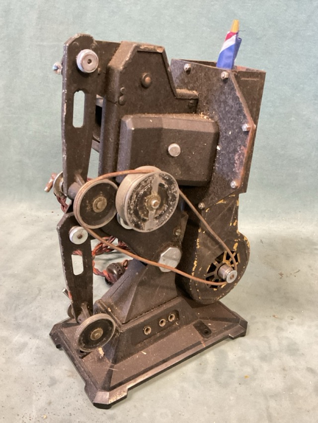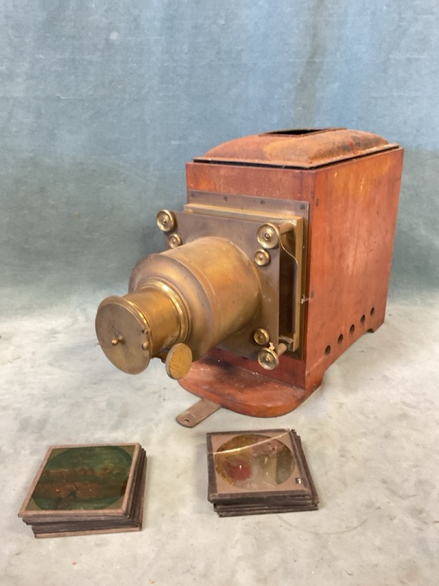 A Victorian mahogany & brass magic lantern projector with two sets of comical glass slides; and a Pathe 200B 9/5 electrical film projector. (4)