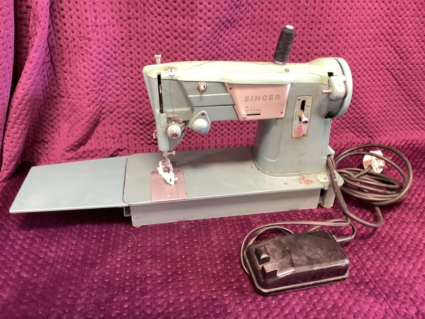 A faux croc cased Singer cast iron black enamelled sewing machine with electric foot mechanism; and a green enamelled Singer sewing machine. (2)
