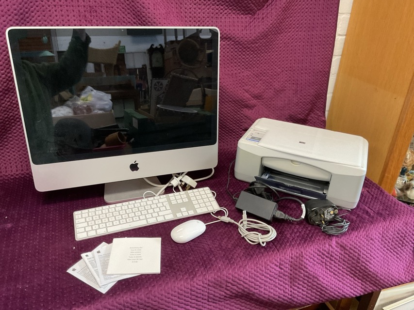 An old Amstrad computer & keyboard - PcW9256; a cased portable Erika manual typewriter; and a modern ‘hardly turned on’ Apple Mac computer with discs, cables and an HP printer. (A lot)