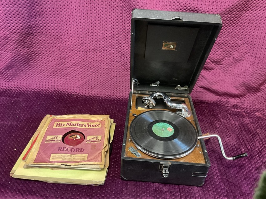 A wind-up His Masters Voice gramophone in working order, together with spare needles and a few 78s. (A lot)