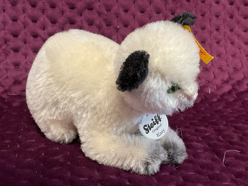 A Steiff black & white mohair Kitty Katze, having green eyes and stitched nose. (5.25in)