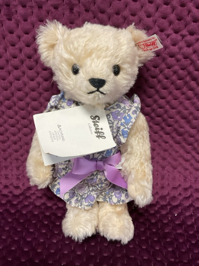 A Steiff Liberty bear with hard mohair body and articulated limbs, wearing a violet floral dress - 10in; and a soft Steiff Clara bear with red cape - 9.25in. (2)