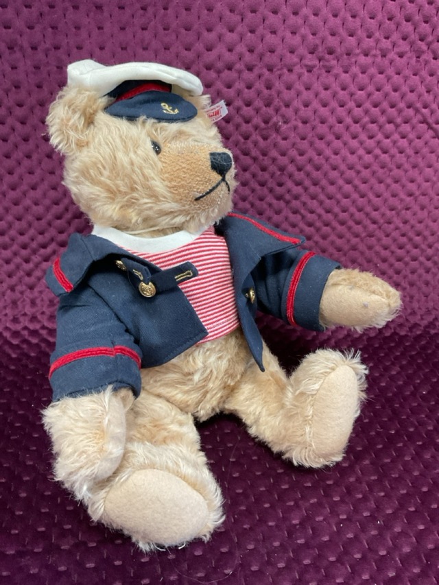 A Steiff mohair limited edition Jack bear in sailors outfit, having jointed arms & legs with felt pads - 13.75in; and a white Steiff soft Bernie bear - 13.5in. (2)