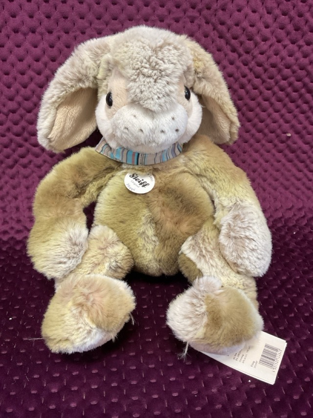 A Steiff soft bodied Schlenkerhase rabbit with striped bandana - 14.5in; and a small bunny with brown fur and felt lined ears - 8in. (2)