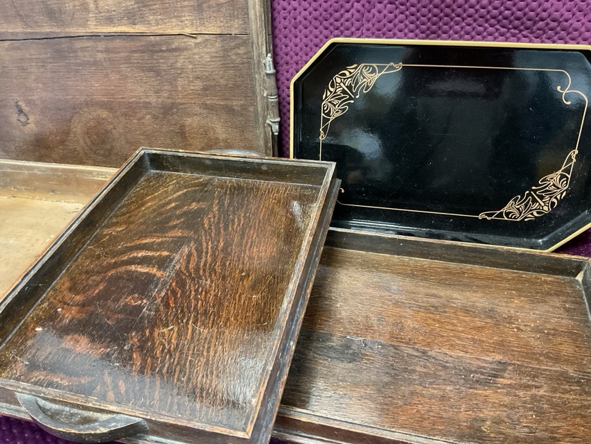 Six miscellaneous rectangular trays - oak rounded with handles, lacquered, butlers type in deal, Chinese mother-of-pearl inlaid, and an oak pair. (6)