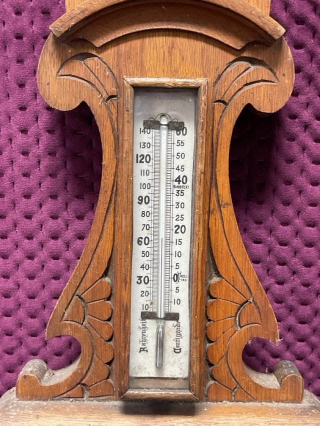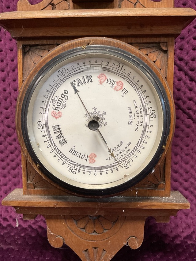 A late Victorian barometer with carved oak case, having circular enamelled dial under bevelled glass with brass bezel, beneath a rectangular thermometer. (23in)