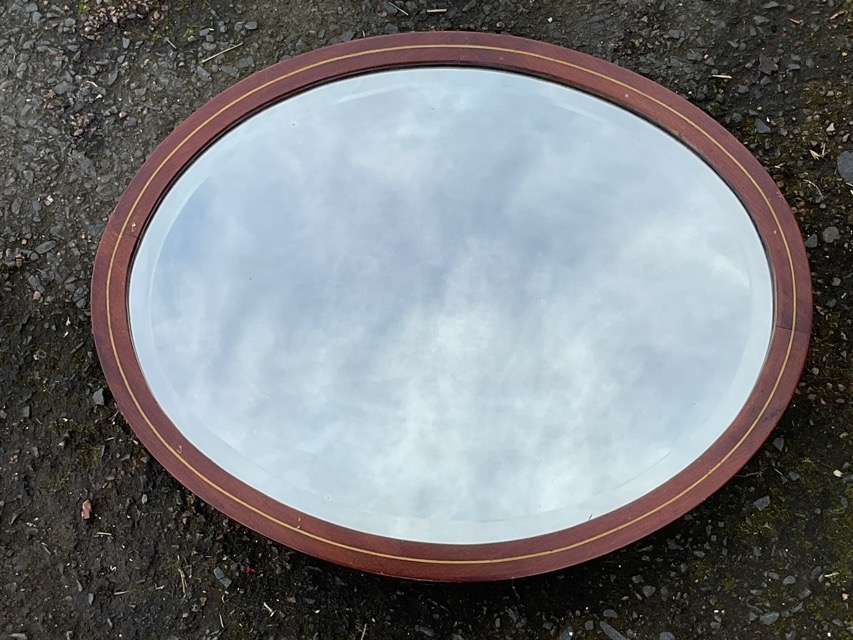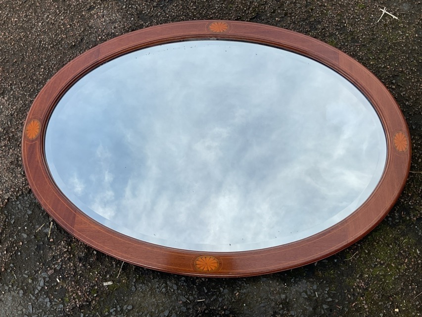 An Edwardian oval mirror with bevelled plate in moulded mahogany frame inlaid with oval shell medallions to quarters; and another oval mahogany bevelled mirror inlaid with boxwood stringing. (33in & 19in) (2)