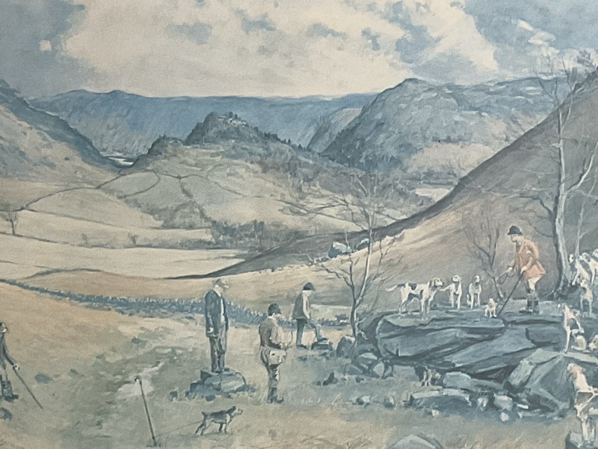 John King, lithograph, landscape below Alnwick Castle with Duke Hugh standing amongst hounds and riders, mounted & framed; and Robin Furness, landscape view of hunt in the field, mounted & framed. (2)