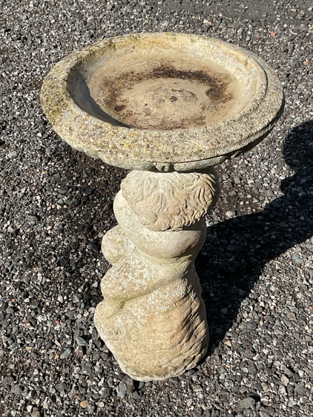 A copmposition stone garden birdbath with circular fluted bowl supported by a cherub seated on naturalistic rock. (22.5in)