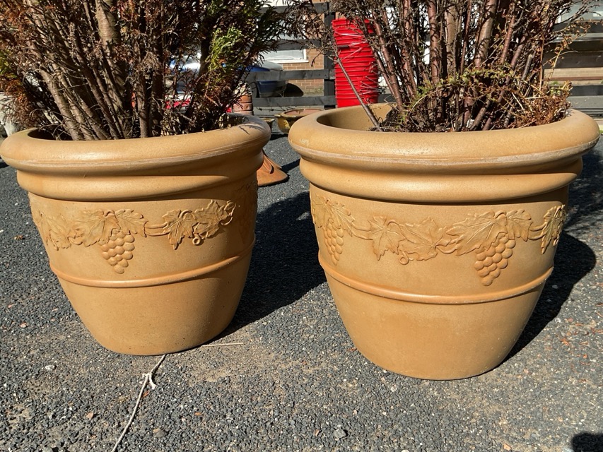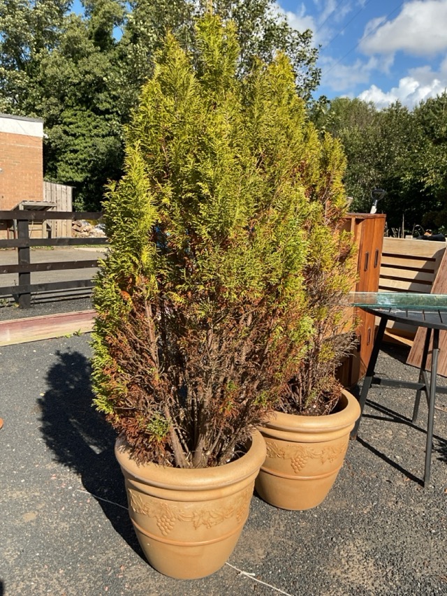 A pair of leylandi trees set into vine moulded plastic urns with cushion rims. (16.5in) (2)