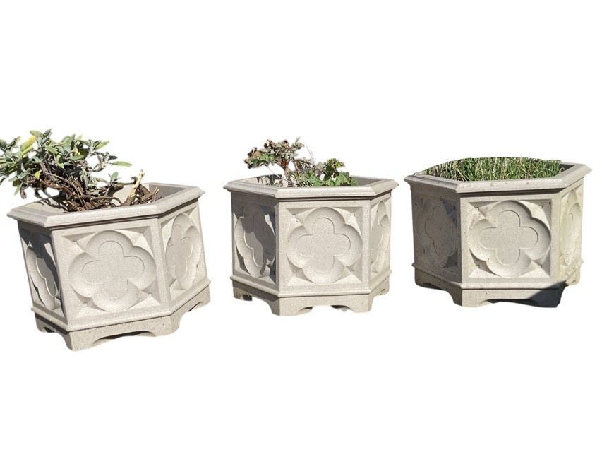 A set of three hexagonal plastic moulded faux stone garden pots with gothic panels to sides. (17.5in x 11.5in) (3)