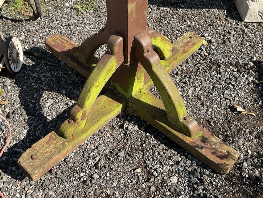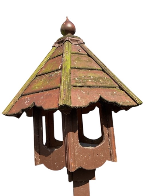 A painted 8ft wood dovecote by Forsham Cottage Arks with hexagonal pitched roof platform having arched apertures and turned finial, supported on a square column, with crossed batten supports on shaped brackets. (96in)