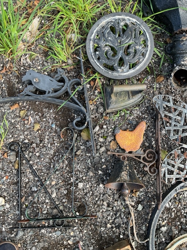 Miscellaneous metalwork - a cast iron driving wheel, a pair of hanging baskets, wall ornaments including a garden bell, a set of three wall brackets, a cast gutter hopper, etc. (A lot)