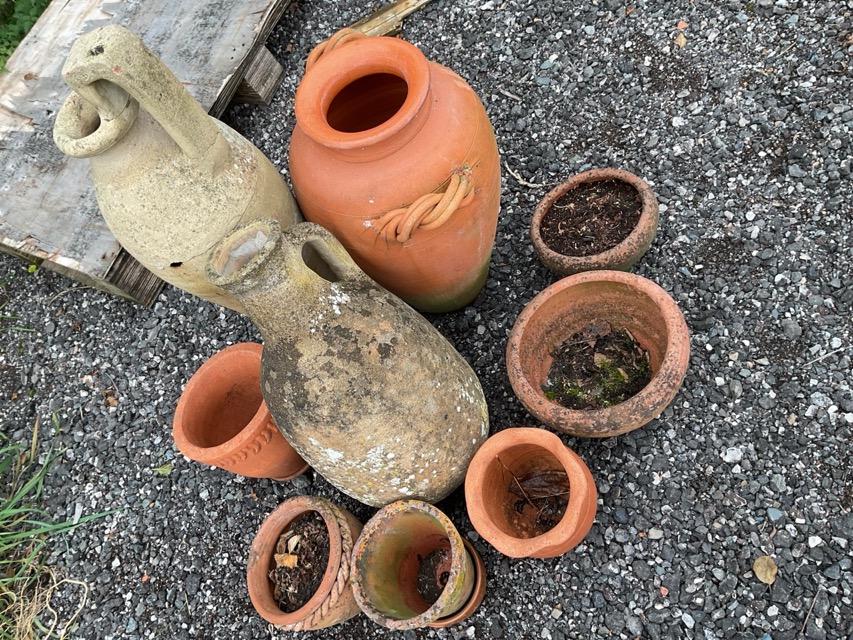 Nine terracotta & stoneware garden pots - Grecian classical style, ropetwist rimmed, bowl type, tall tapering urn with twisted handles, waved rim, etc. (9)
