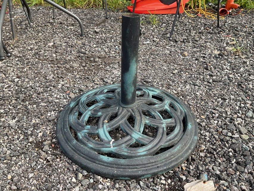 A pair of cast iron D-shaped entranceway panels with pierced foliate scrolled decoration; and a iron sunshade stand with pierced interwoven circular base. (3)