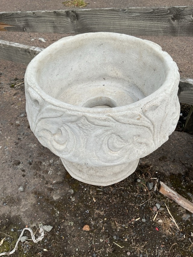 A pair of composition stone urns of tulip shape cast with foliate scrolled leaves on fluted socles. (16in x 15in) (2)