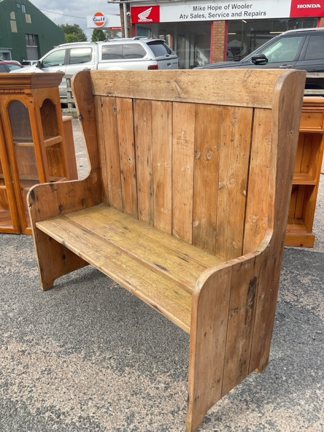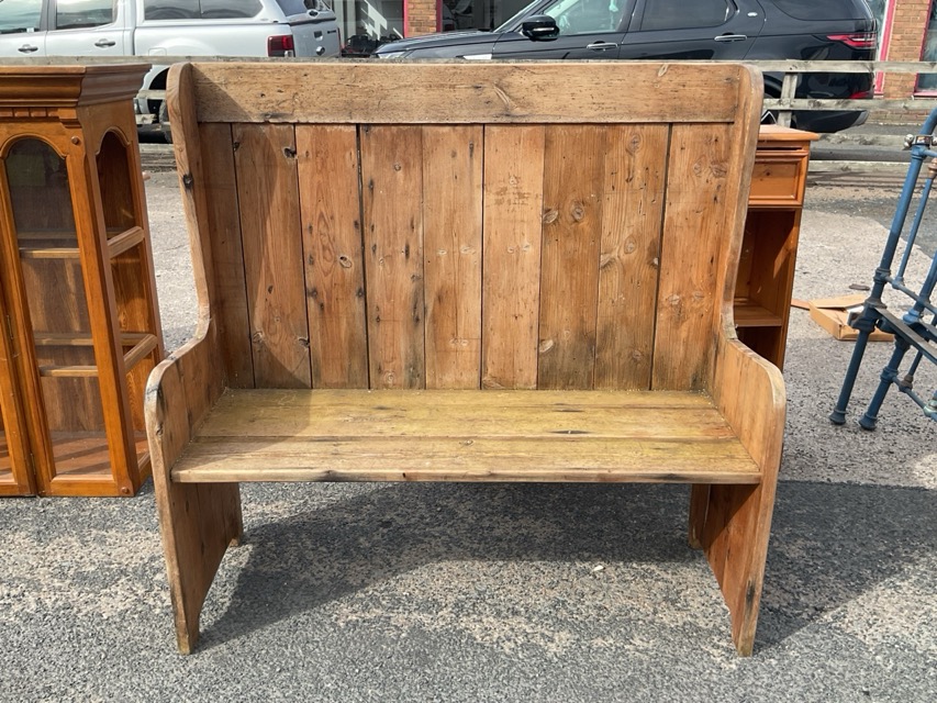 A hall settle formed from old pine boards with tongue & grooved back and plank seat, having shaped side wings & supports. (49in)