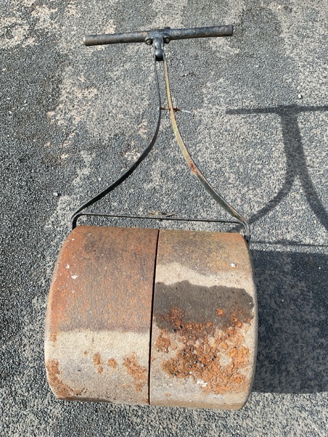 A garden roller with twin cast iron drum and wrought iron waisted handle with T-bar. (19.5in x 48in)