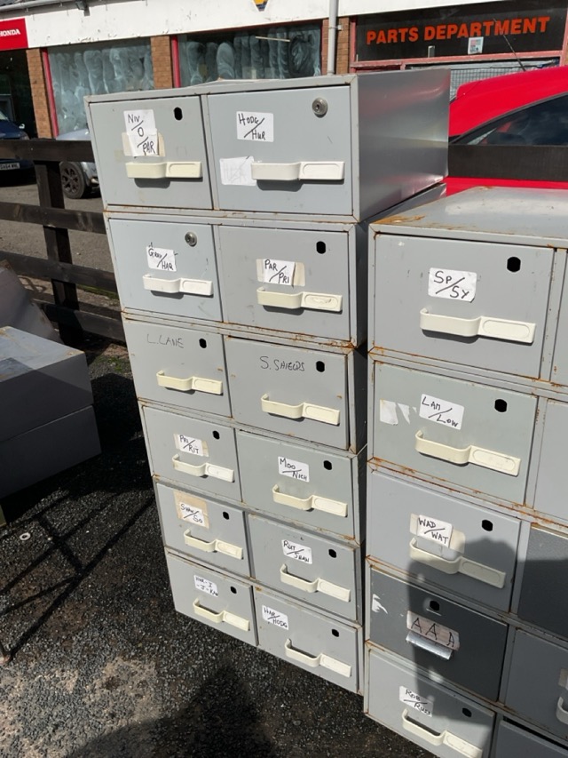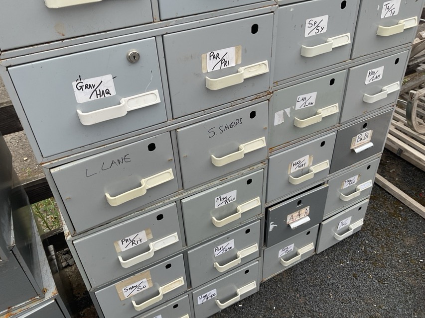 32 metal drawers housed as twins in 16 cabinets. (16)