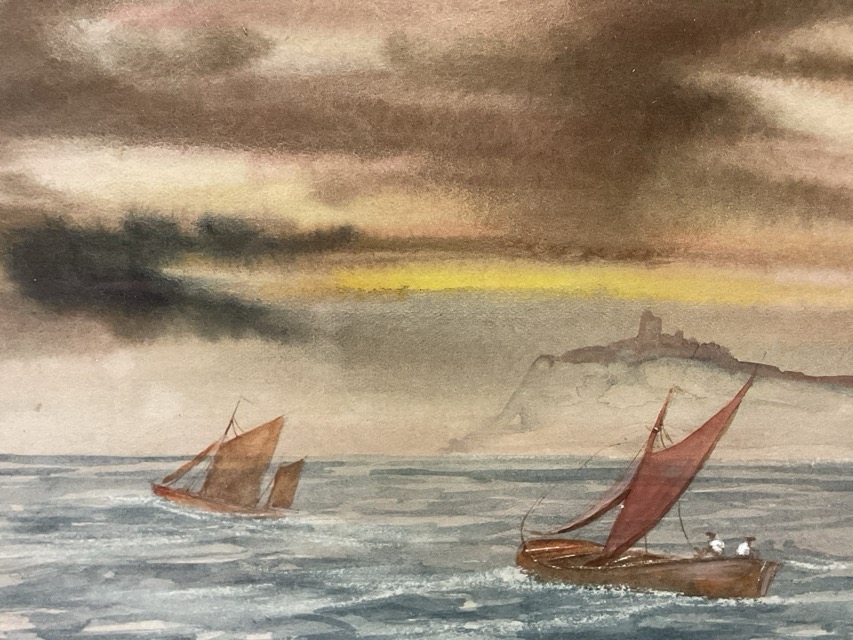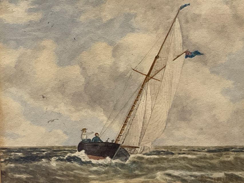 Victorian watercolour, sailboat on choppy seas, signed indistinctly, mounted & framed; and another later watercolour, two sailboats at sea with distant castle, mounted & framed. (2)