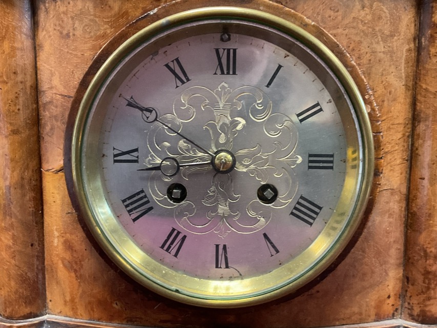 A C19th walnut mantle clock with architectural style case on moulded plinth, the French eight-day movement having brass scroll engraved dial with roman chapters. (14in)