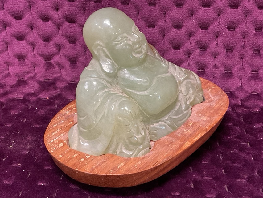 A carved jade seated buddha on hardwood fitted stand. (4in)