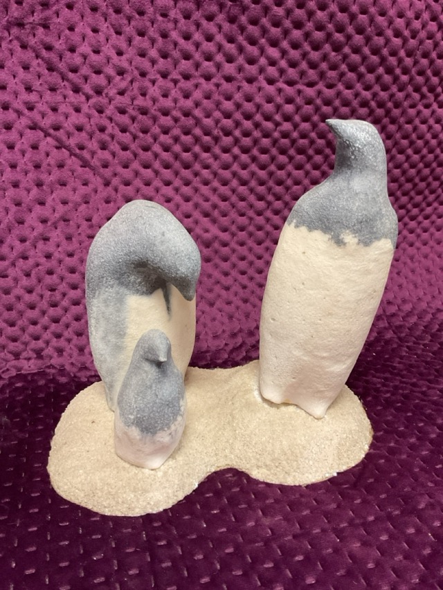 A carved soapstone Inuit group with three figures fishing with dog, mounted on rectangular rounded plinth; and a resin group of three penguins. (2)