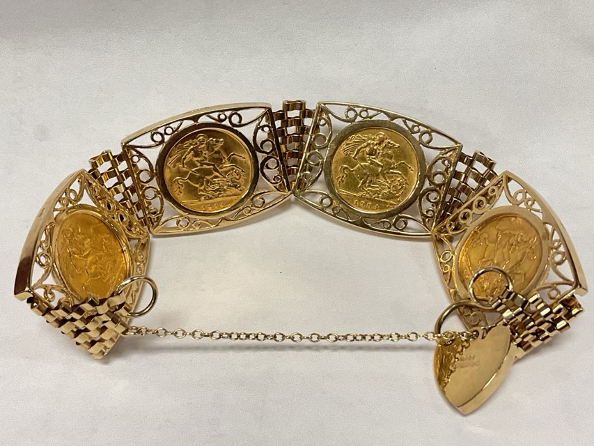 A 9ct gold bracelet set with four half sovereigns in panels - 1904, 1905, 1908 & 1914, joined by gate links with padlock safety chain. (39.9g)