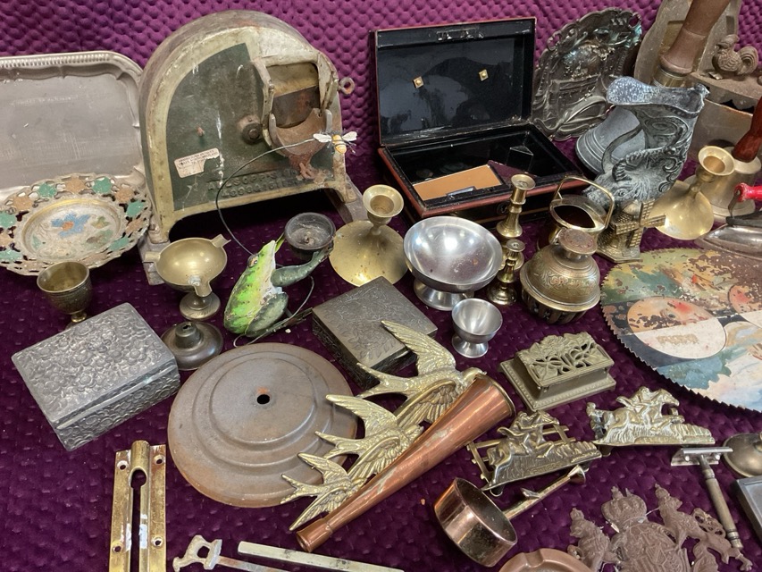 Miscellaneous metal collectors items - brass, flatirons, school bells, a tin money box, coins, cigarette boxes, door knobs, candlesticks, a copper hunting horn, a Chinese bull vessel, a chopper, etc. (A lot)