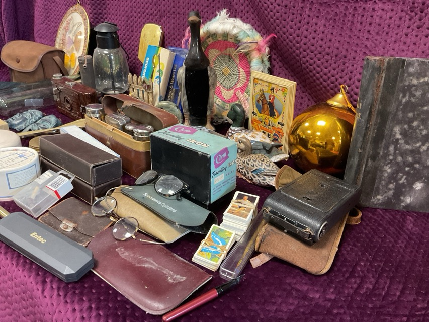 Miscellaneous collectors items - cameras, irons, painted wood ducks, pens, a papiémaché plate,boxed darts, an old account book, two glass rolling pins, brushes, etc. (A lot)