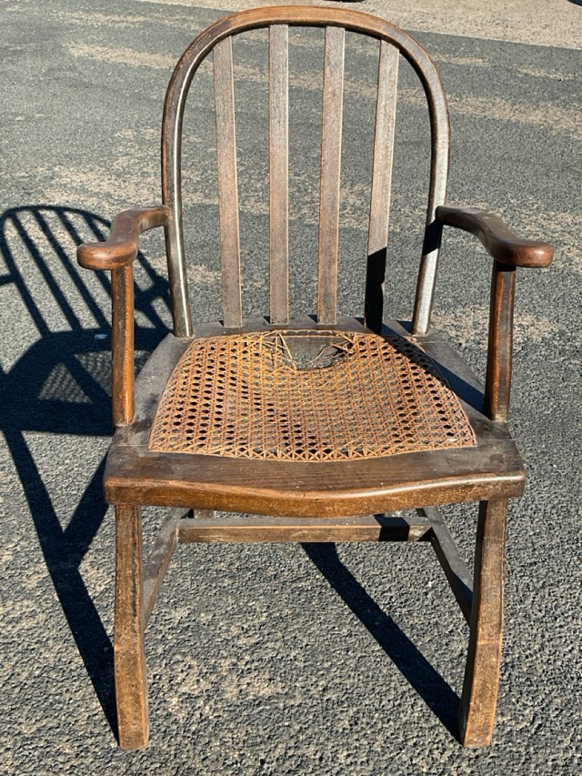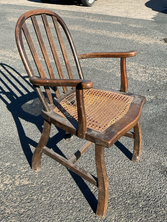 An arts and crafts beech armchair with hooped slatted back above a serpentine fronted caned seat flanked by outscrolled arms, raised on curved legs joined by stretchers.