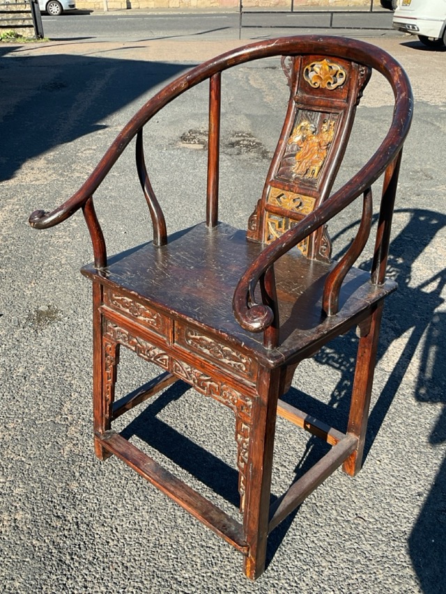 An antique Chinese hardwood armchair with hooped back and outscrolled arms, the rectangular splat pierced, carved and gilded with panels of floral motifs and figures, above a seat with pierced carved apron, raised on square legs joined by stretchers.