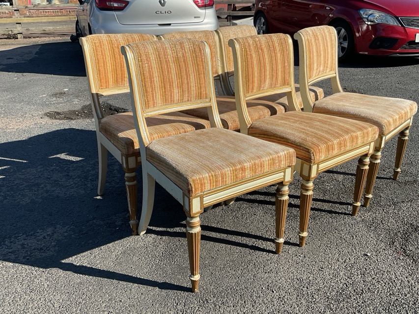 A set of six regency style painted gilded dining chairs with outscrolled upholstered backs above conforming flared rectangular seats, with panelled rails and blocks, raised on turned tapering reeded legs. (6)