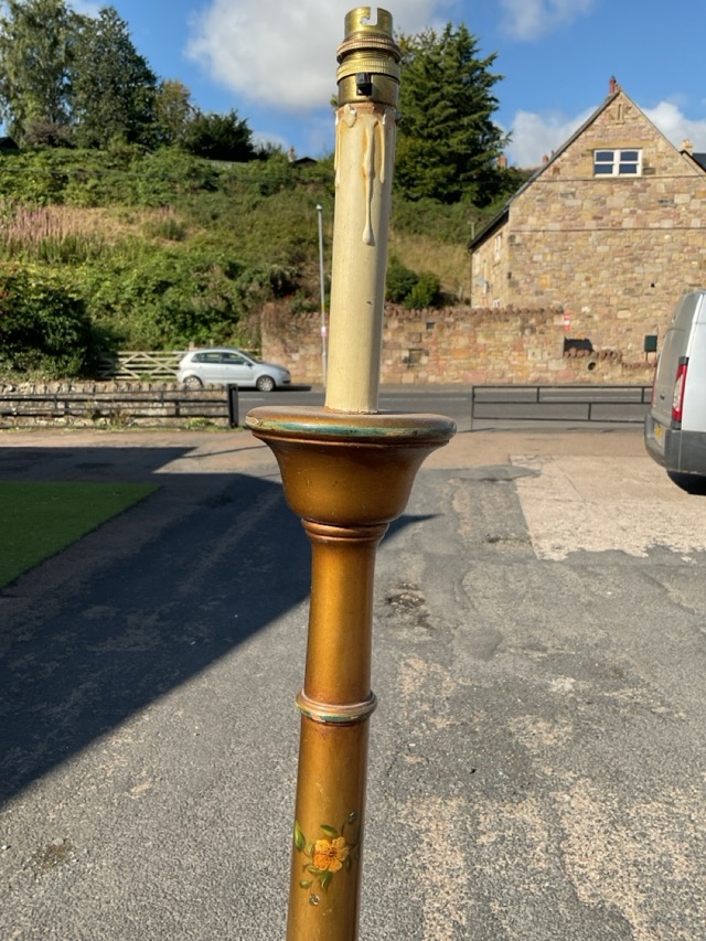 A gold lacquered standard lamp with candlelight above a turned tapering column on a dished circular base, decorated with handpainted floral sprays. (68in)