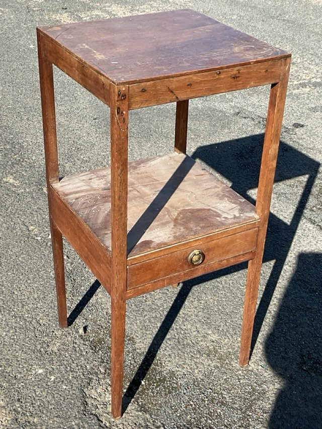 A Georgian mahogany bedside table with square top above an undershelf with brass ring handled drawer, raised on square legs. (15in x 15in x 32in)