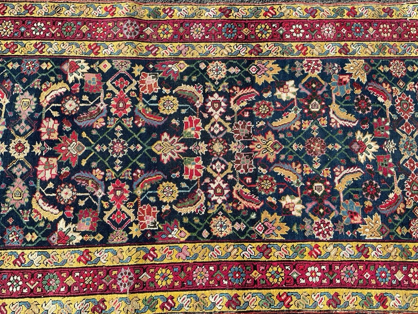 A Tabriz wool runner woven with symmetrical scrolled flowers and foliage on a dark blue field, within meandering flowering vine and flowerhead borders. (41.25in x 209in)