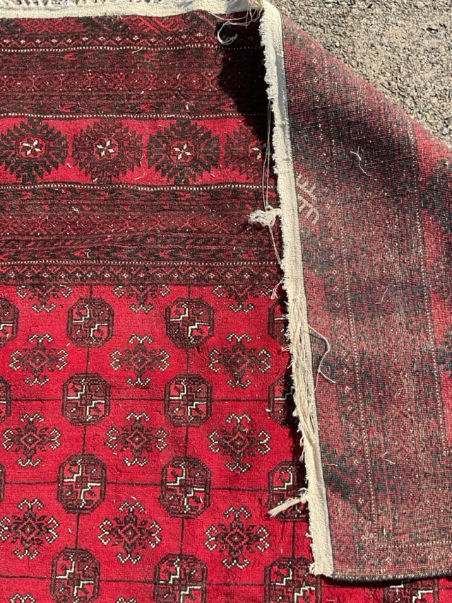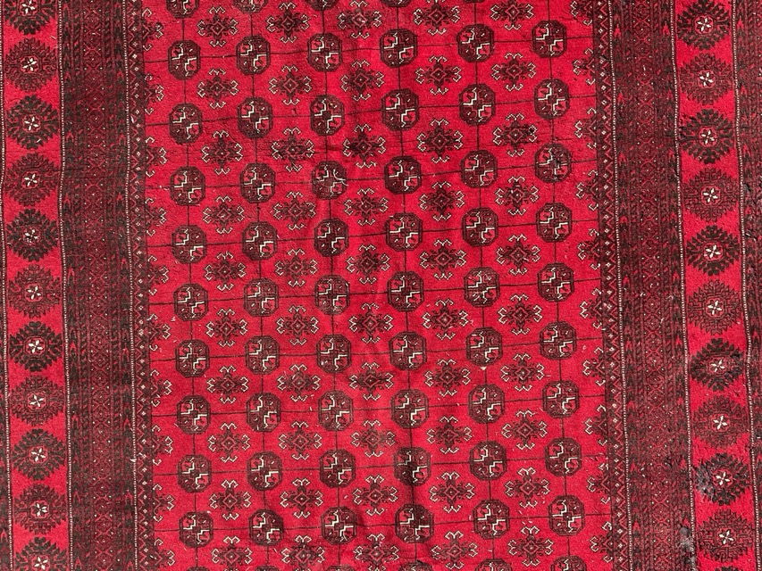 A Turkmen wool carpet woven with six rows of circular gul motifs on a red field within geometric floral borders. (77.5in x 117in)