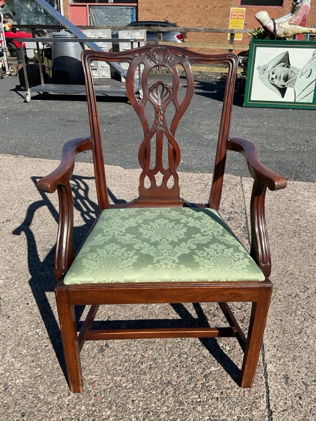 A Chippendale style mahogany armchair with foliate carved pierced splat above a drop-in upholstered seat flanked by serpentine shaped arms, raised on square legs joined by stretchers.