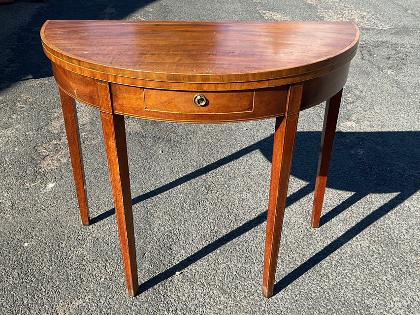 A Georgian crossbanded mahogany demilune folding card table with circular baize lined top above a boxwood strung frieze with brass ring handled drawer, raised on tapering square legs. (36.5in x 36.5in x 29.5in)