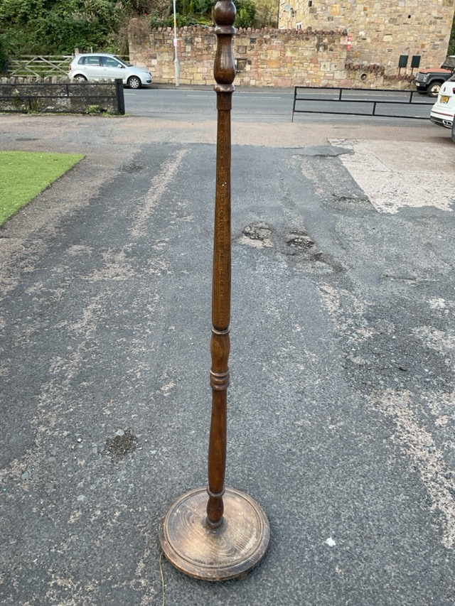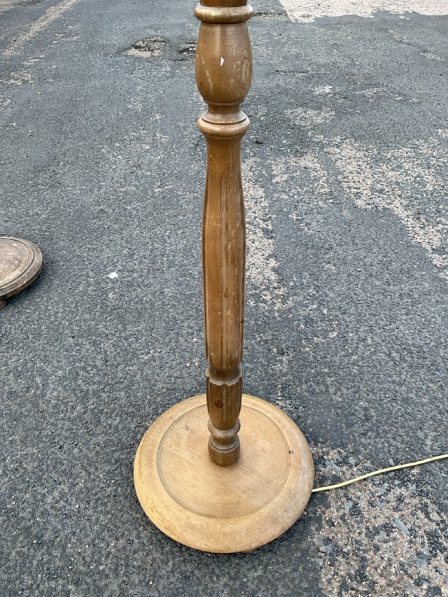 A beech standard lamp with turned fluted column on a circular base - 61in; and another similar with turned column - 60in. (2)