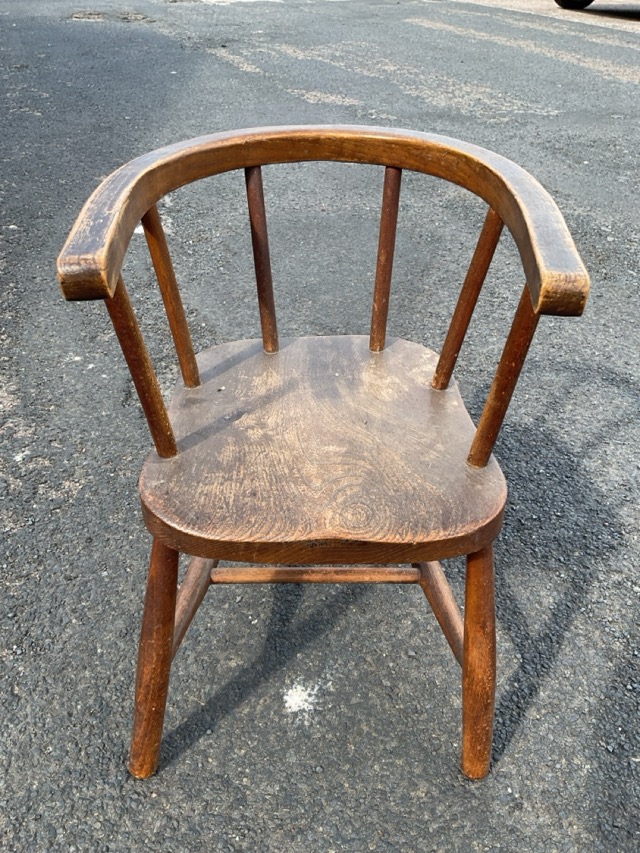 A hardwood childs armchair with horseshoe shaped back on spindle supports above a solid dished seat, raised on cylindrical legs joined by stretchers.