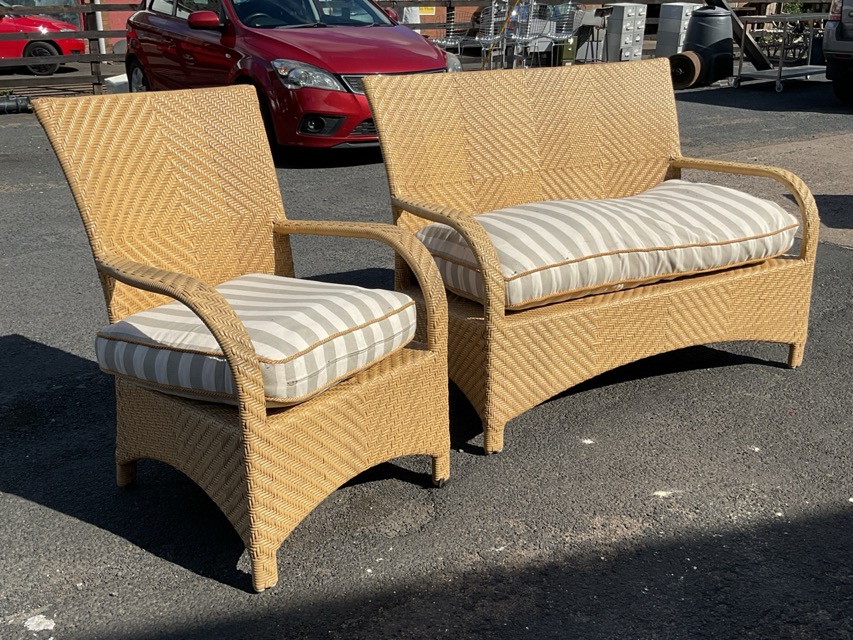 A woven faux cane two-seater patio sofa and armchair, the rectangular backs and seats with loose cushions flanked by curved arms above arched aprons, raised on rectangular feet. (2)