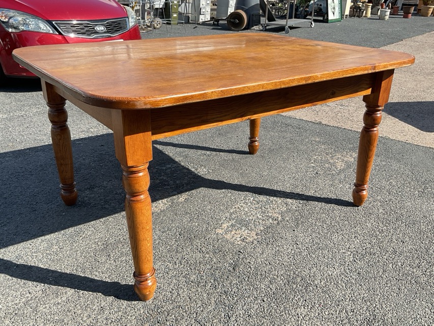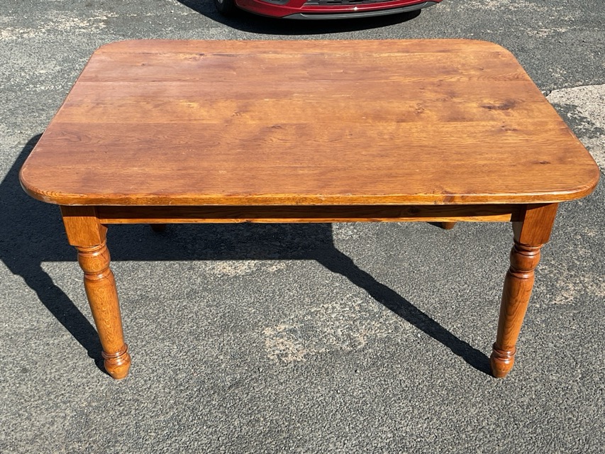 An oak kitchen table with rounded rectangular top above a plain apron, raised on turned tapering legs. (60in x 44in x 30.5in)