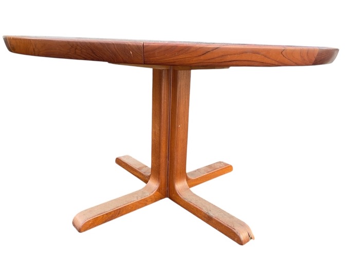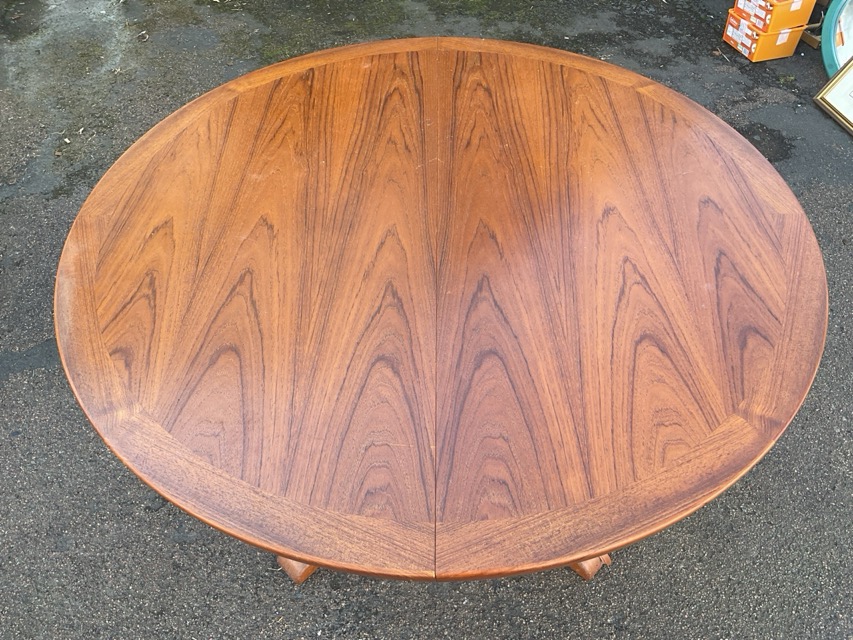 A Danish teak circular extending dining table by Skovby, with crossbanded demilune ends raised on L-shaped supports - no leaf. (49in x 49in x 29.5in)