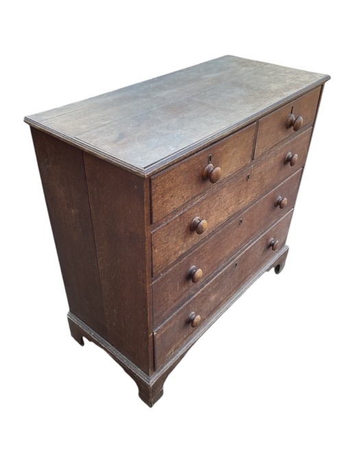A nineteenth century oak chest of drawers with rectangular moulded top above five mahogany knobbed drawers, raised on bracket feet. (40in x 18.5in x 38.5in)