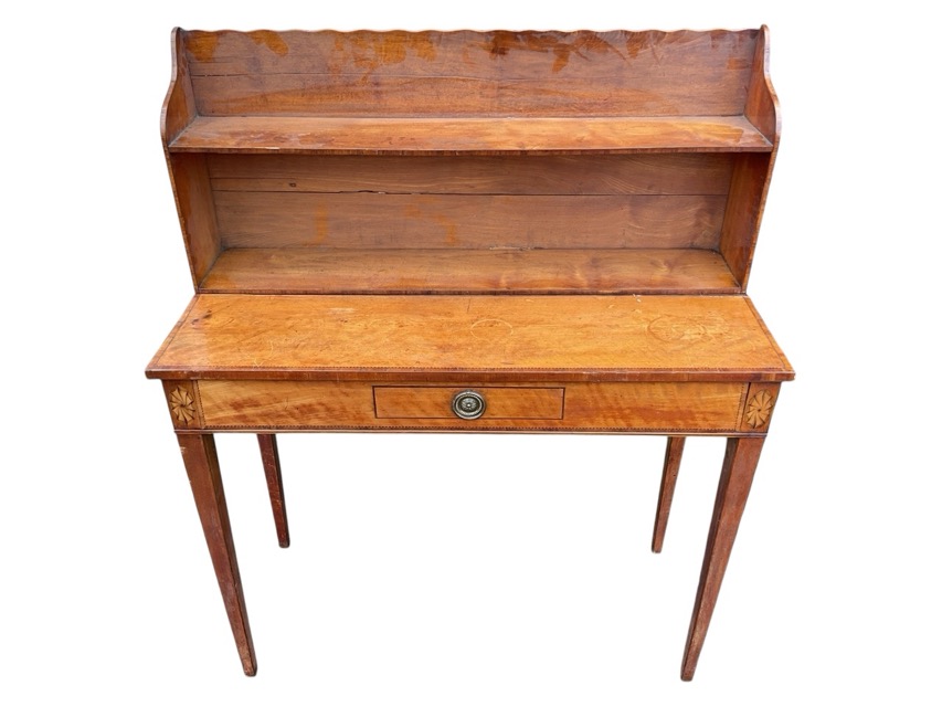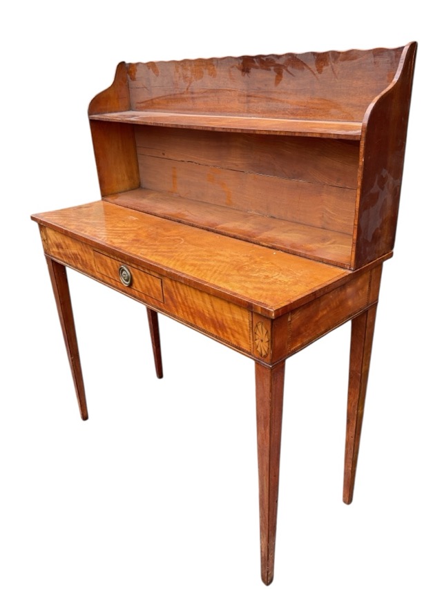 A Georgian rosewood crossbanded chequer strung satinwood bookcase table with two open shelves above a rectangular top with gilt brass ring handled frieze drawer flanked by oval fan inlaid medallions, raised on tapering square legs. (36.25in x 15in x 43.75in)