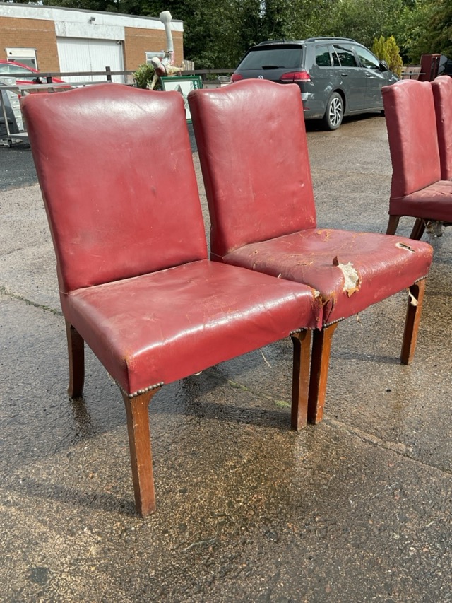 A pair of Georgian mahogany Chippendale style studded leather upholstered chairs with camel backs and flared rectangular seats, raised on chamfered square legs. (2)