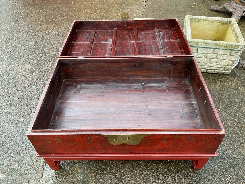A C19th Chinese red lacquer chest with brass handles and butterfly shaped escutcheon decorated in gilt with cavorting figures, butterflies, and phoenixes, on a low stand. (30.5in x 19.75in x 16.75in)